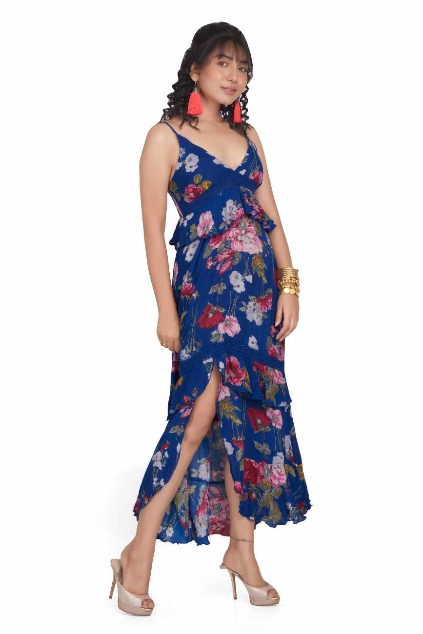 Rove v neck ruffle trim cutout sheer mesh maxi dress
